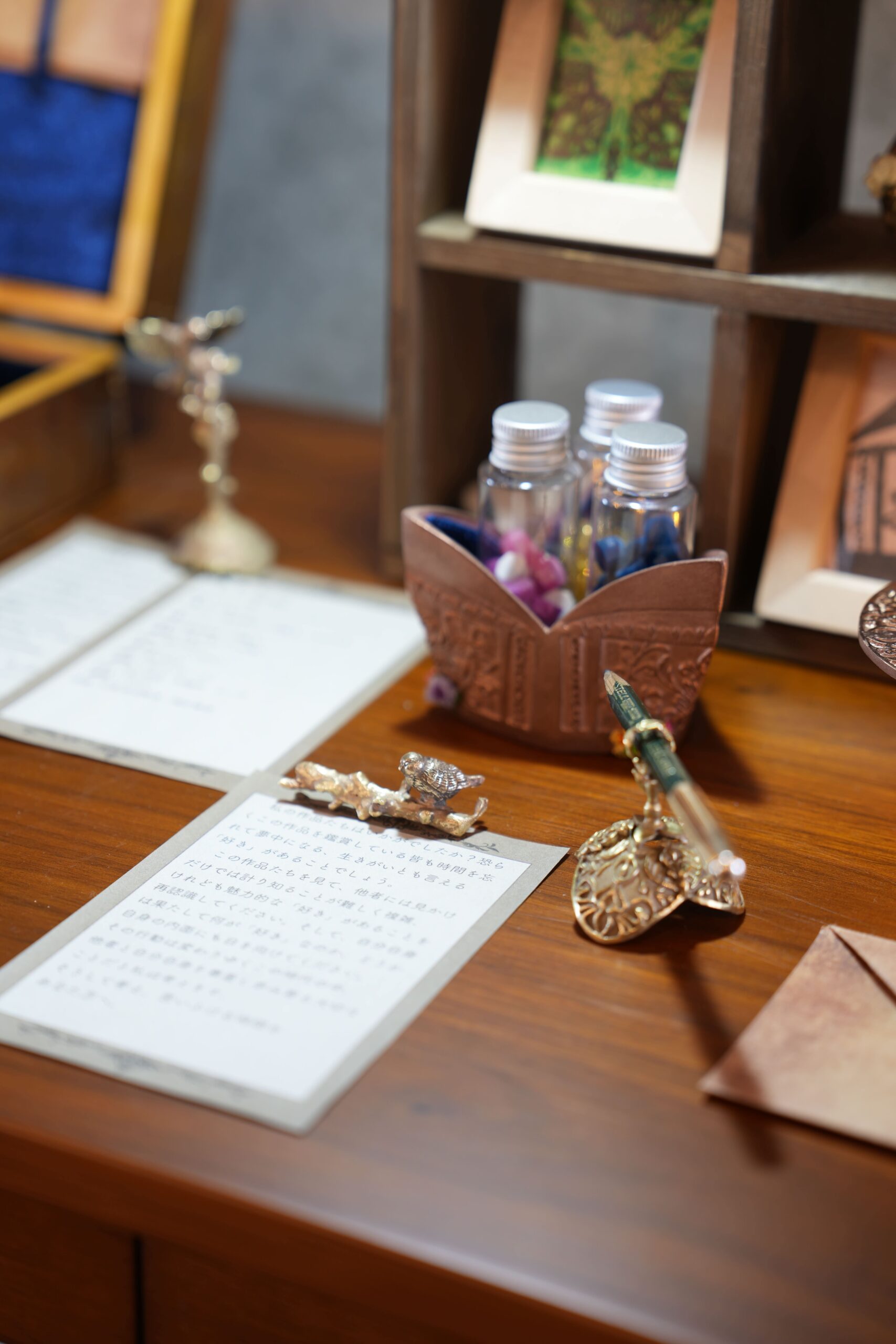 まるでその空間に人が生活しているように箱に整頓さえていた状態からそれぞれの用途に合わせて卓上に展開され、カトラリー、文鎮、本の角金、シーリングスタンプ、ワックスを溶かす匙とそれを置く机、ブローチ、小物入れ、ペン立てがあり、どれも切り紙を元にした美しい装飾模様をあしらっています。