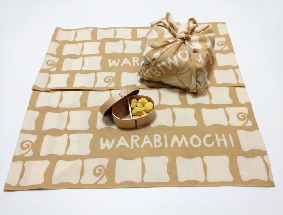 わらび餅を抽象的に表現したビジュアルと、わらびをモチーフにしたグラフィックを組み合わせたパターングラフィックの手ぬぐいを制作。わっぱ弁当に入れたわらび餅を包むパッケージデザインを考えました。
