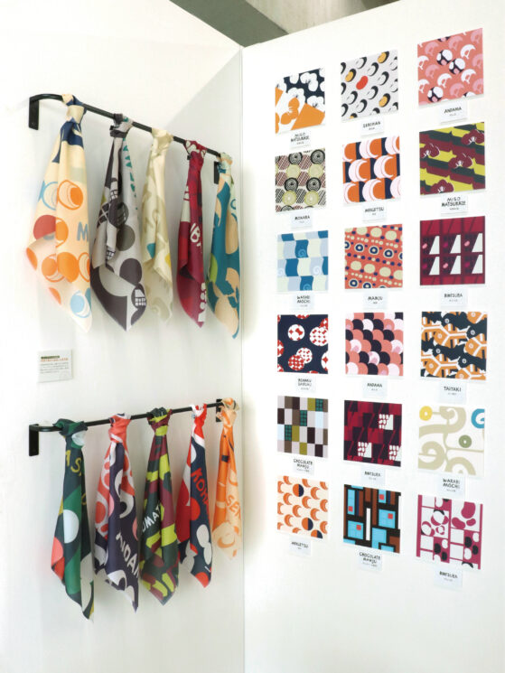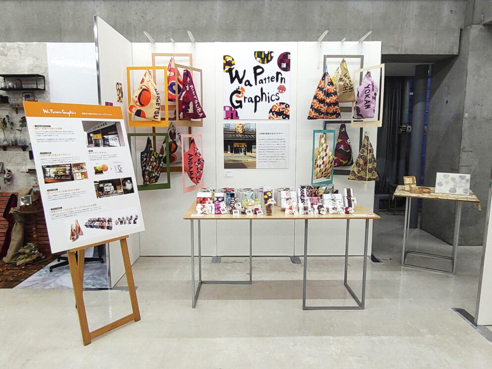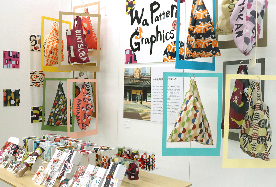和菓子のパターングラフィックを活かし、カラフルでワクワクする展示を目指しました。エコバッグや風呂敷など、作品の見せ方にもこだわりました。