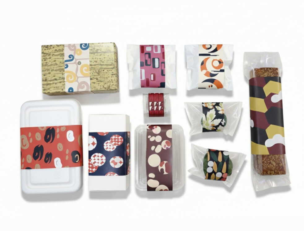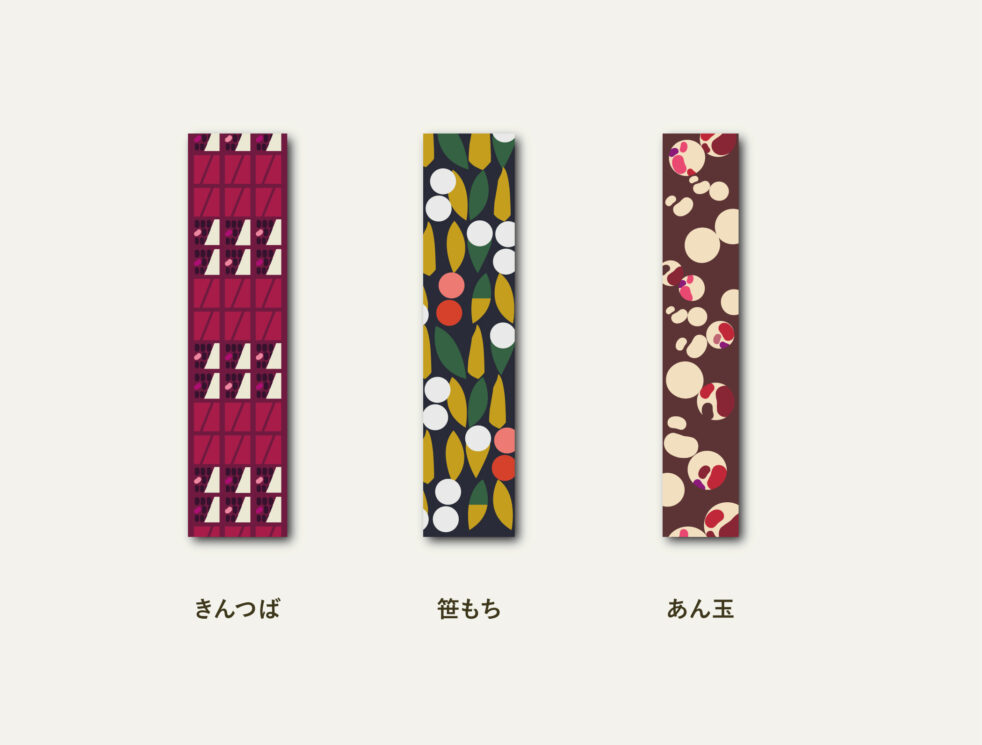 そこで、商品の個包装に帯を巻くことで、帯が「ブランドとしての顔」になるのではと考え、和菓子のモチーフや魅力をパターングラフィックで表現した帯を巻くことを提案しました。