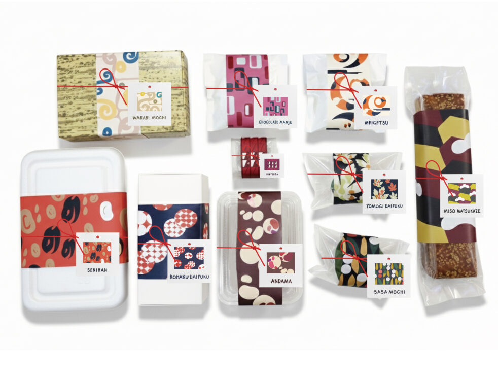 和菓子に込められたおいしさや温もりを、欧文書の商品名とパターングラフィックで表現したタグを制作。赤い紐で結んだタグをつけて統一することで、新しい「和モダン」なパッケージに仕上げました。