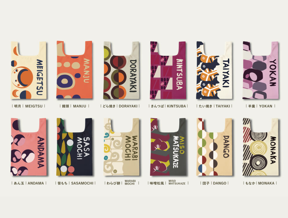 帯として制作したデザインに加え、有名な和菓子を選び、パターングラフィックを活かしたエコバッグを制作。日常で使用されるエコバッグを通して、和菓子の魅力が伝わるデザインを目指しました。