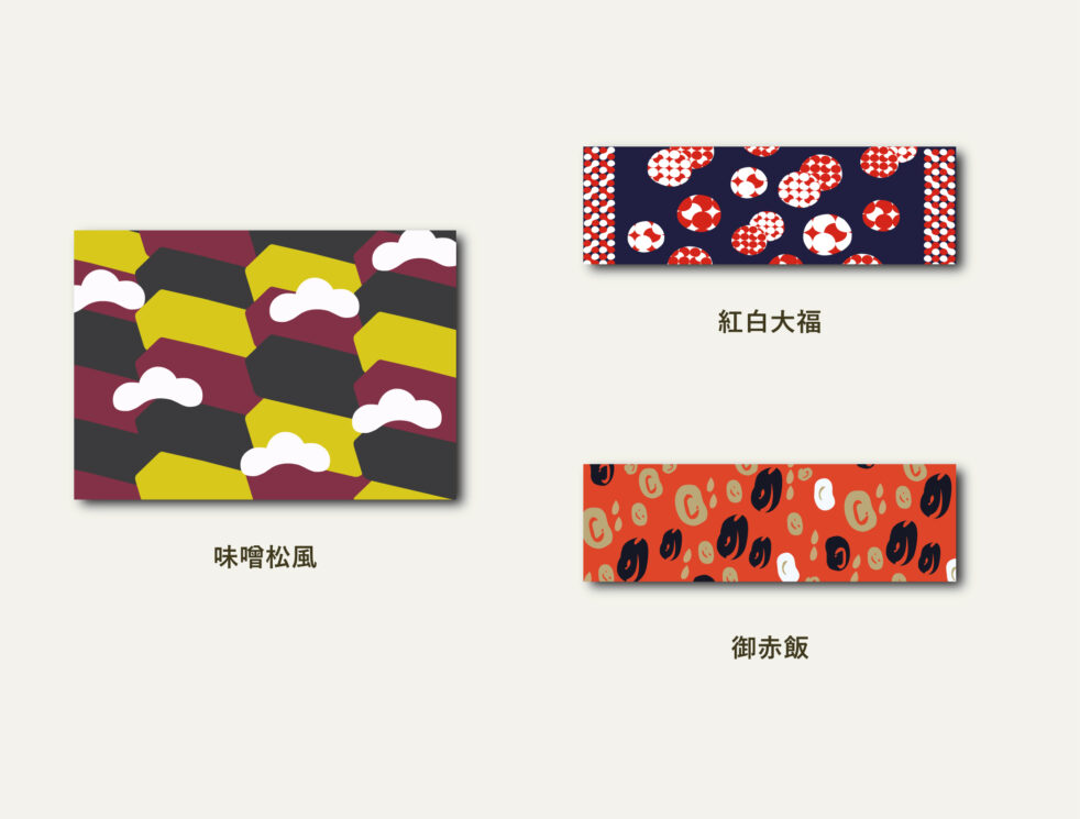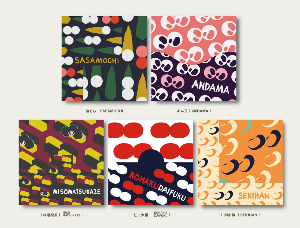 10種類の商品を対象に、和菓子の見た目や特徴を基にしたパターングラフィック柄の風呂敷を制作。模様の向きや動きによる見え方の変化に着目し、構図を分割したデザインに仕上げました。