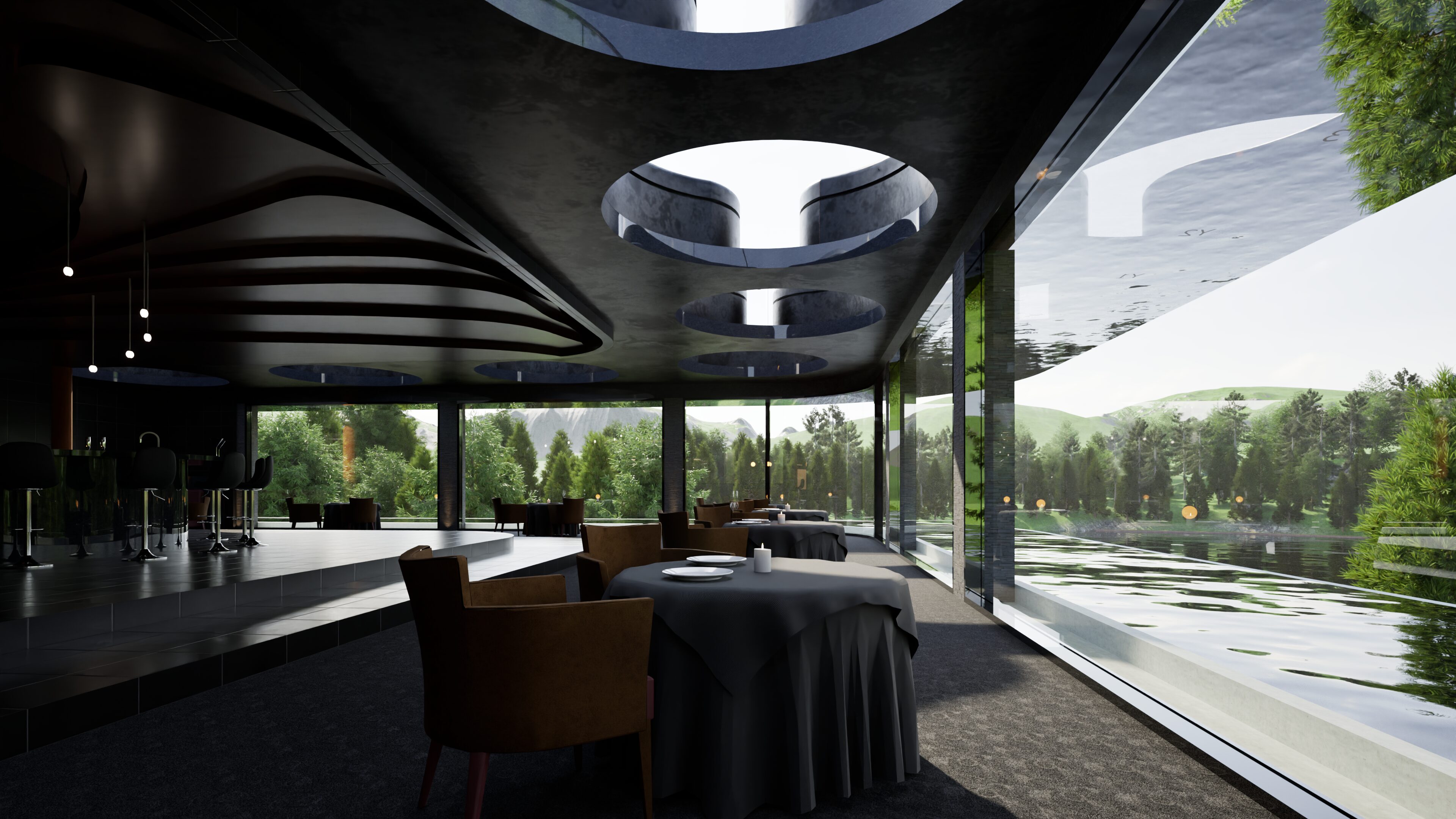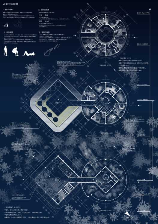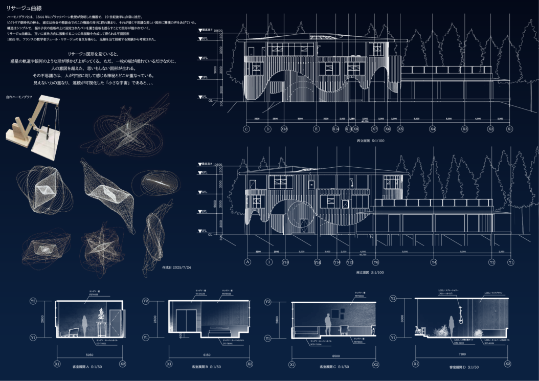 この二つの異なる揺れを「宇宙の揺らぎ」と「人の揺らぎ」と捉え交差する状態を建築デザインに落とし込んだ。