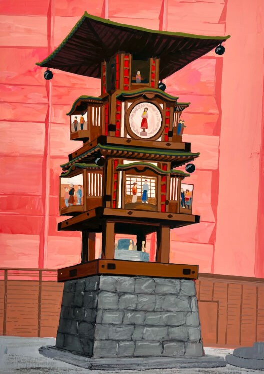 路面電車を道後温泉駅で降りると1番に目に入るのは、道後商店街『ハイカラ通り』と大きな時計台。この時計台は夏目漱石の小説『坊ちゃん』にちなんで作られ、毎時0分になると文字盤が開き、小説の登場人物たちが音楽に合わせて動き出すカラクリ仕掛けになっている。 夜にはライトアップされ、昼間とはまた違った幻想的な雰囲気を味わえる。 レトロなデザインは道後温泉の雰囲気にもぴったりで、多くの観光客にも人気な場所となっている。