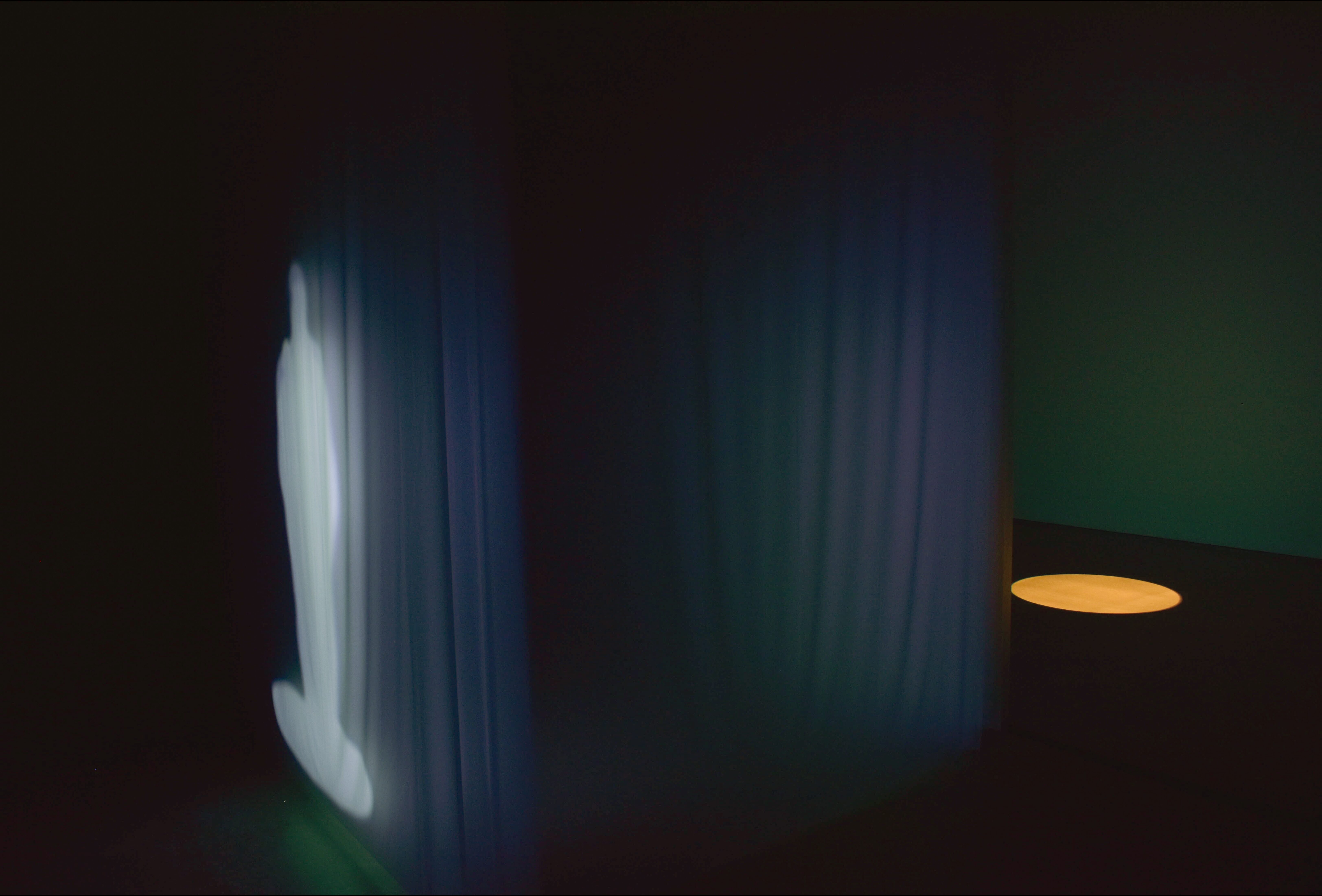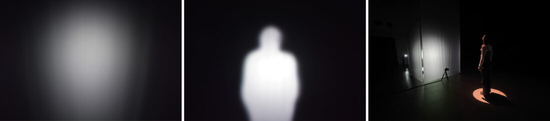同時に、反対側には、身体がカメラによって読み取られ、映像へと変換され、「情報となった私」として空間に現れる。その光は自分でありながら、すでに自分のもとを離れ、他者の視線の中で成立した、もう一つの自己の姿。スポットライトの下の私も、情報として変換された私も、どちらも他者との関係の中で立ち上がる自己像にすぎない。結局、「自分」という輪郭は、他者の視線なしには形成されないのではないか。そして、自分が思っている自分と、他者から見られている自分の間に生まれるずれや曖昧さの中でこそ、自己という存在は揺らぎながら成立していくだろう。