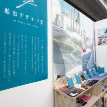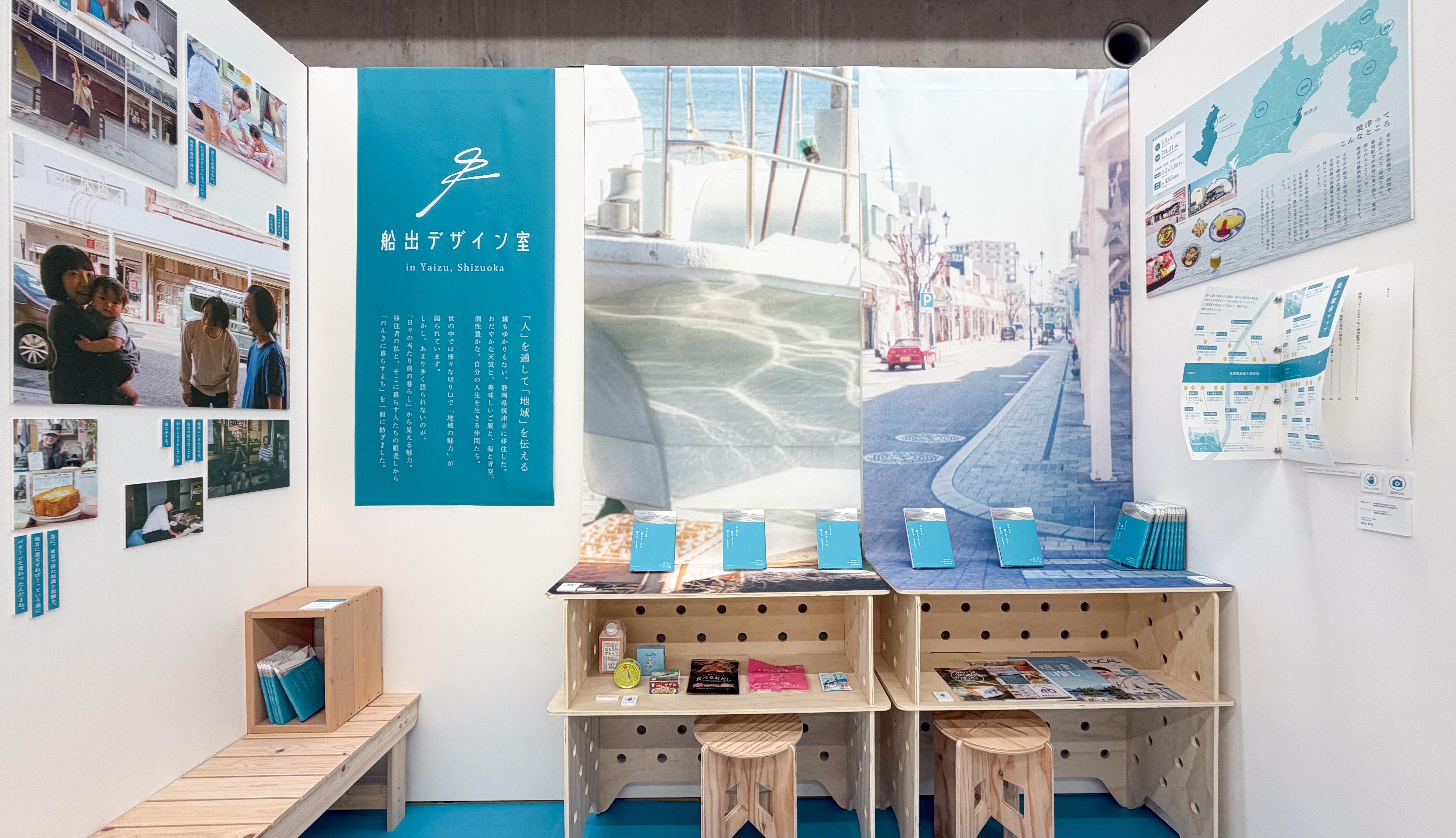 本の中から抜粋した写真、ページ、言葉を展示しました。焼津のお土産と公式パンフレット、商店街のおしゃべりの場に欠かせないベンチも一緒に。