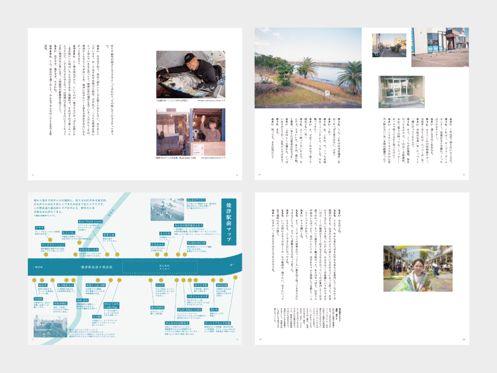 トークテーマは、普段遊んでいる場所、焼津に行き着くまでの人生、焼津のお祭り、仕事と暮らしなどなど…1問1答のインタビューではなく、その場で生まれる質問や対話をそのまま文字に起こしてまとめ、実際に暮らす人たちのリアルな想いを定着させました。