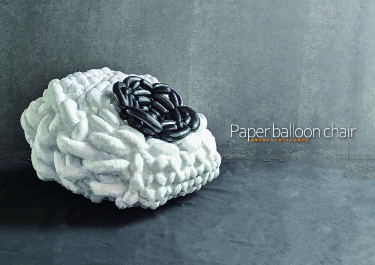 この椅子は細く長いペンシルバルーンを編み、それらを型とし、そこへ紙を貼り重ねることで形状をつくっていく。
