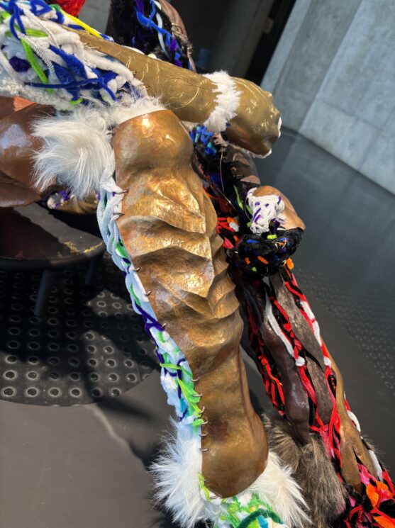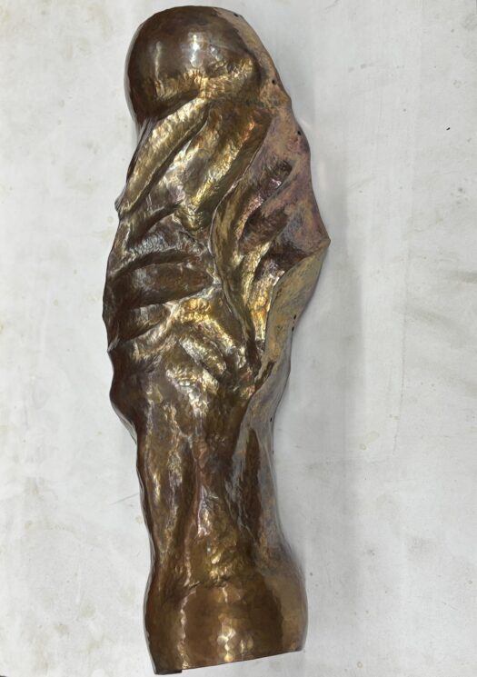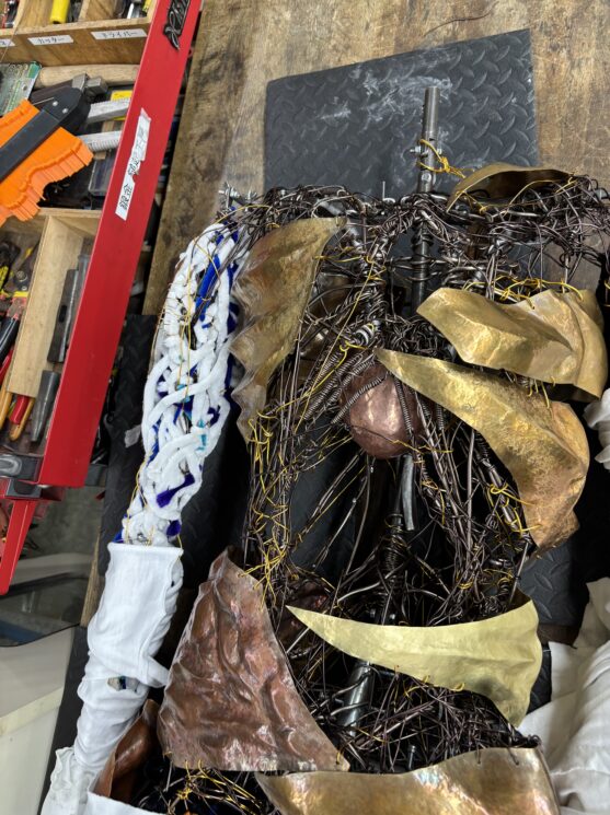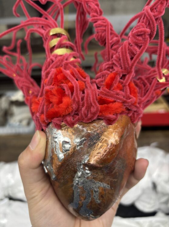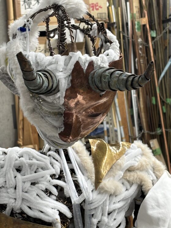 何かをつくる作業に没頭する、使えそうな材料を集める、つくりたい物のイメージを考え描き出す。<つくる自分>とは 制作に関連することに向き合う自分である。鍛金技法により制作するときも、モールや針金から制作するときも、<つくる自分>が軸にあることは変わらない。制作は自分にとって楽しいことであり続け、好きであることの継続は、作ることを自分らしさの一つに変え支えてくれている。つくることへ没頭することは、究極に自分のための時間である。周りの人と関わる時の自分とは違うような、もう一人の自分として支えてくれている感覚を持っている。自分のつくることに大きく関わった鍛金技法とモールアートを組み合わせることで、<つくる自分>を形として再現することを試みる。