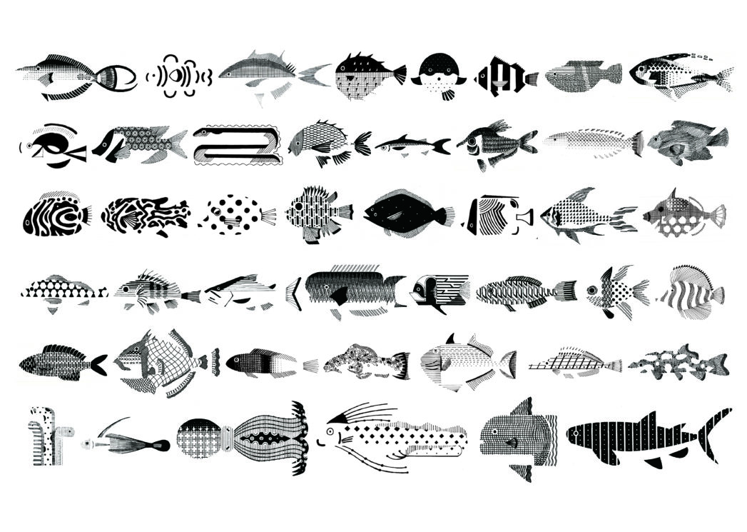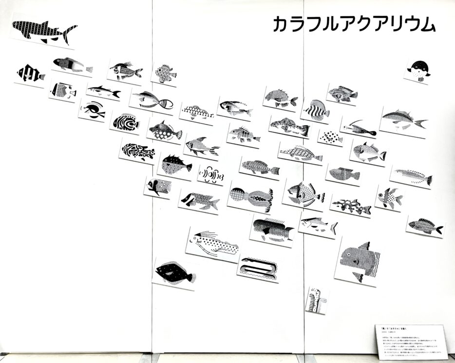 黒一色でありながらも、線や模様の違いによって生まれる色のイメージに着目しながら、ユニークな魚たちの表情を楽しんでいただきたい。