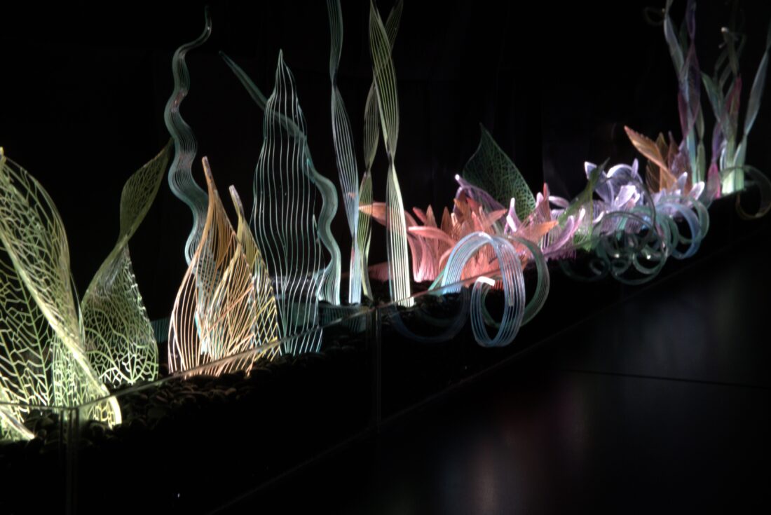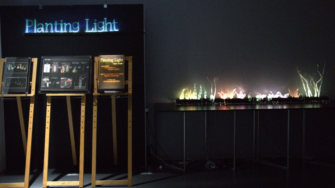 植物デザインのアクリル板を挿すことで点灯する「光を生ける」生け花型の照明