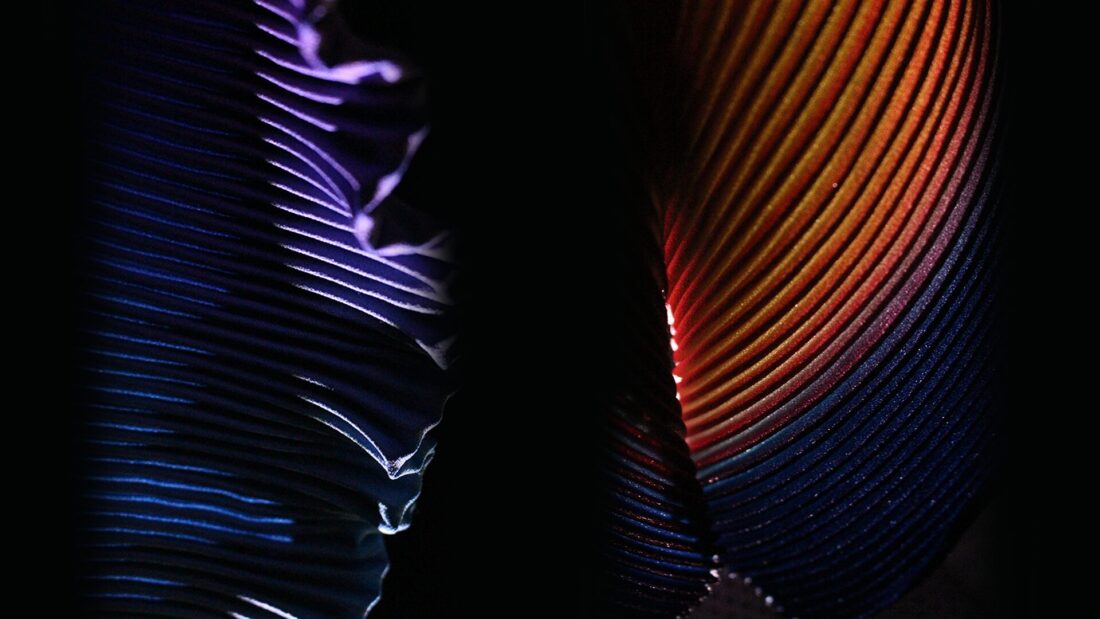 数多の試作を経て、色彩と構造が織りなす有機的なテキスタイルを製作。ひだの部分のみに色を染め、同時に立体を形作ることで、まるで生き物のような造形を可能にした。