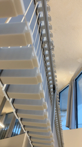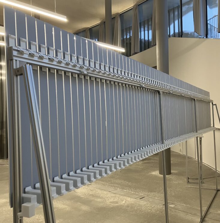 ウェーブマシンの機構を鏡と組み合わせ、連動的な波の動作を生むことでスリットスキャンのような時間差の像の歪みが生まれます。