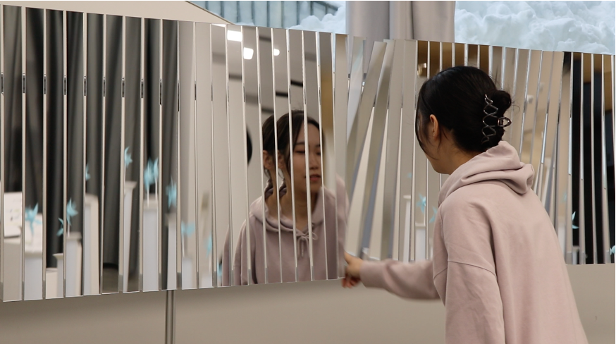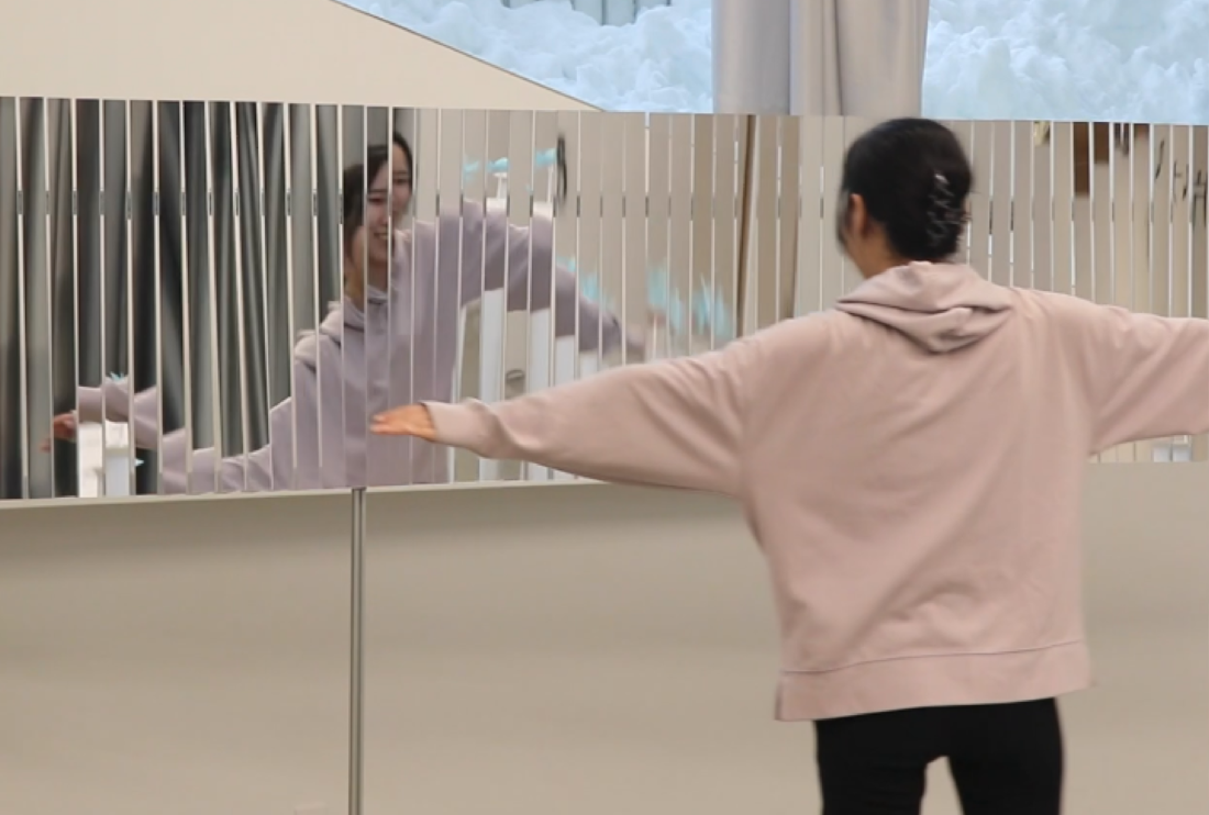 鑑賞者が鏡を押すことで動作し、鏡に映る像の連動的な揺らぎを体験するインスタレーション作品です。