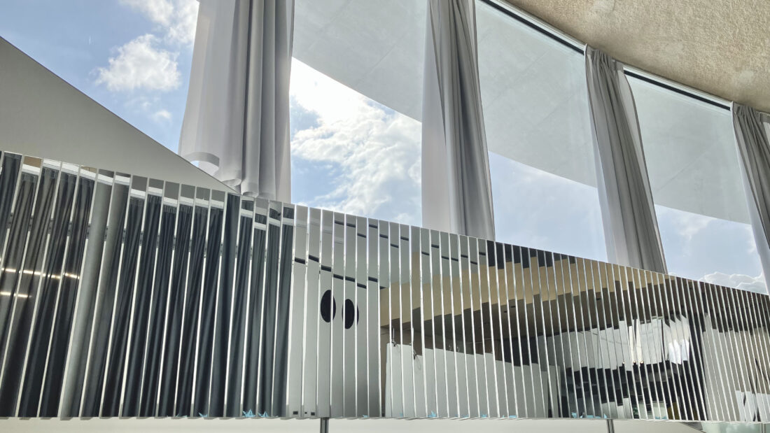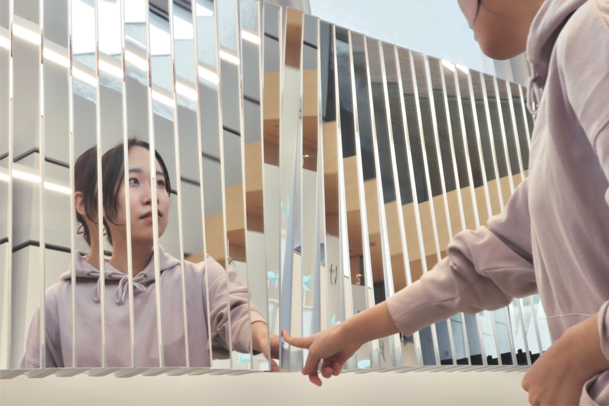 鑑賞者自身や周囲の景色 ・ 光を取り込み、映る世界を変形させます。
