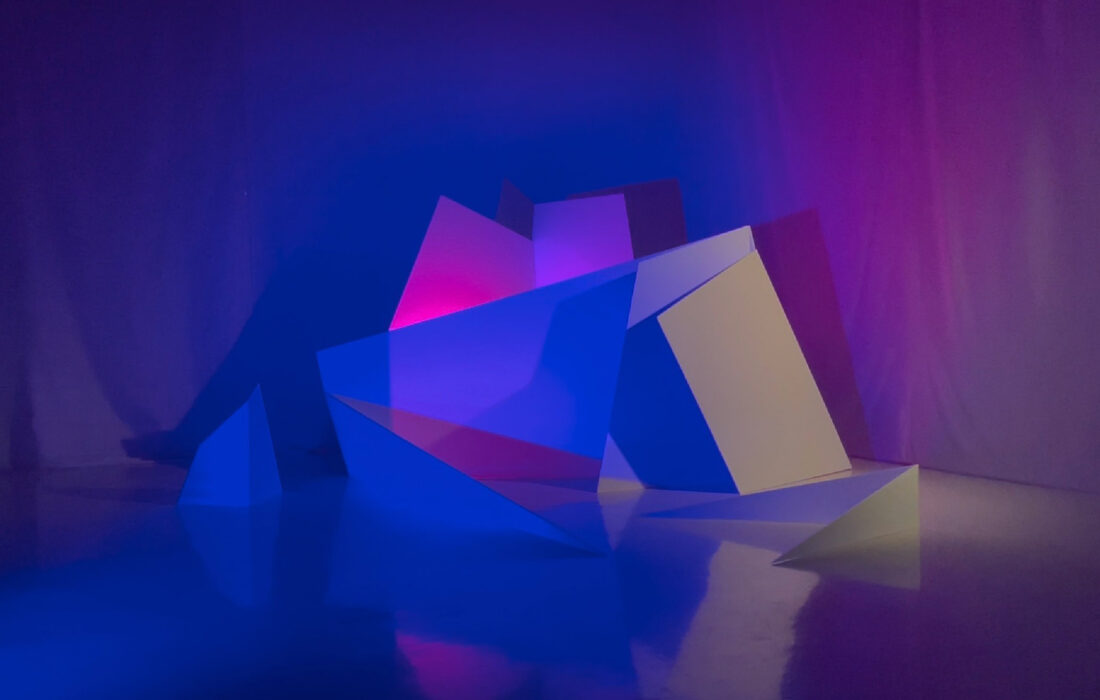 複数の板(あくまで色を受け取るための支持体)を構成した空間で、光は時間とともにゆっくり変化し、色の境界は常に揺れ動く。また、半透明の布で光が滞留・拡散する層をつくり、境界が曖昧になる瞬間を光と空間を通して表現する。光の変化による物体と影、空間の奥行きなど、知覚のズレを身体感覚として受け取る。光を単なる照明としてではなく、知覚を揺さぶる存在として扱い、”0と1”の明確と曖昧さの間にある体験を通して知覚そのものを再考するきっかけを与える。