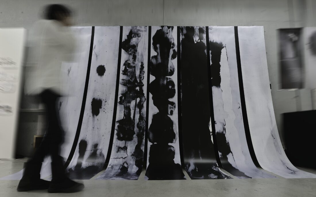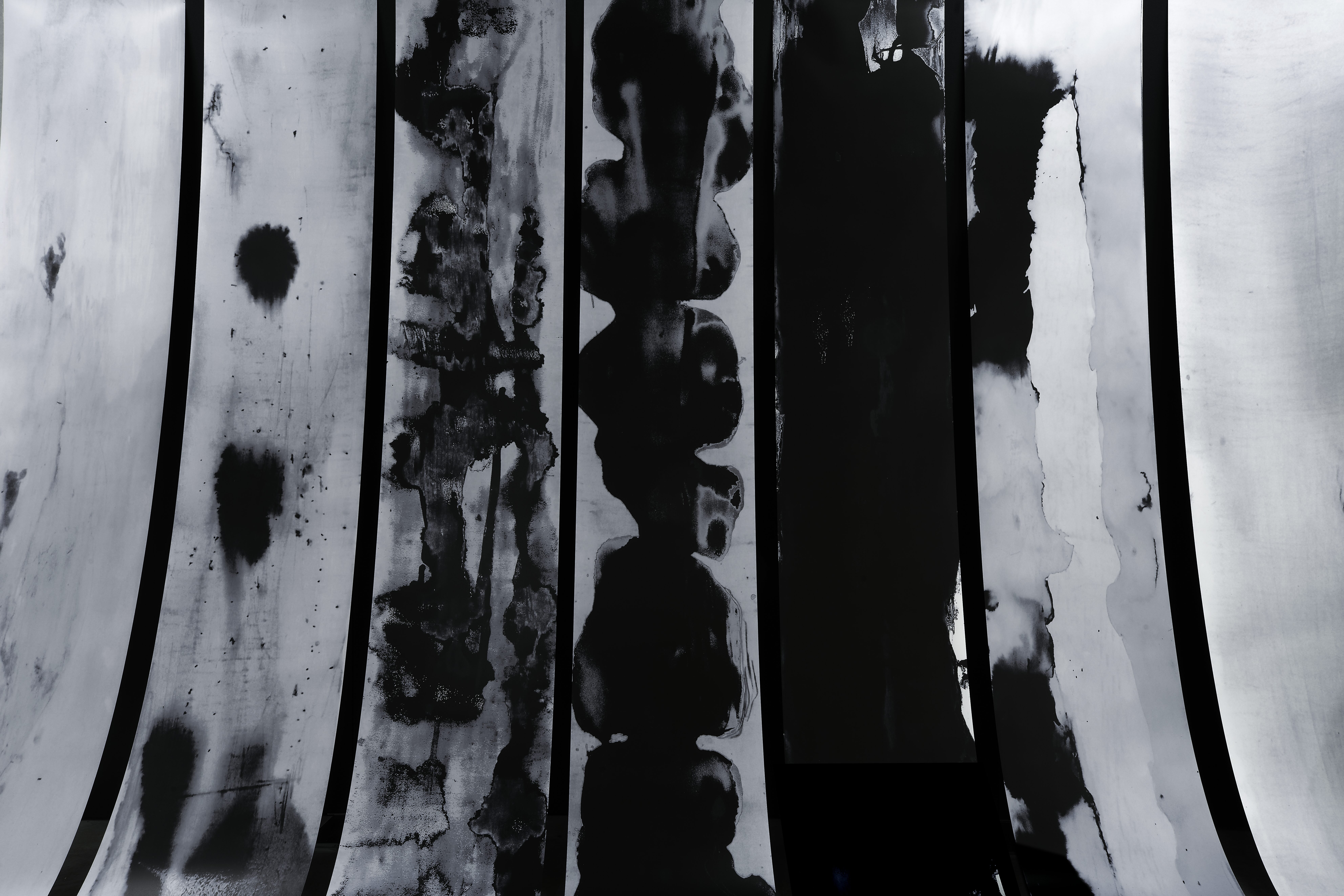 展示では7点を縦に配置し、滝の流れのような構成とすることで、音楽の時間的推移を空間体験へと置き換えた。