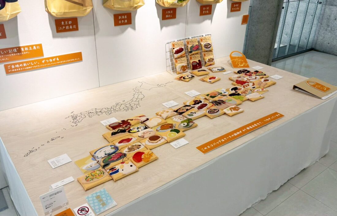 展示では、47都道府県のケースを旅の地図のように配置し、壁面には抜粋したエコバッグを展示することで、デザインの細部や擬態の仕掛けを見てもらえる構成にしました。