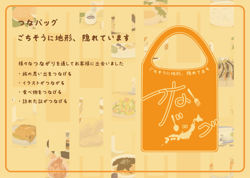 「つなバッグ」という名前には、食べもの・旅の記憶・地域・人との会話など、さまざまな“つながり”を生む存在であってほしいという願いを込めています。