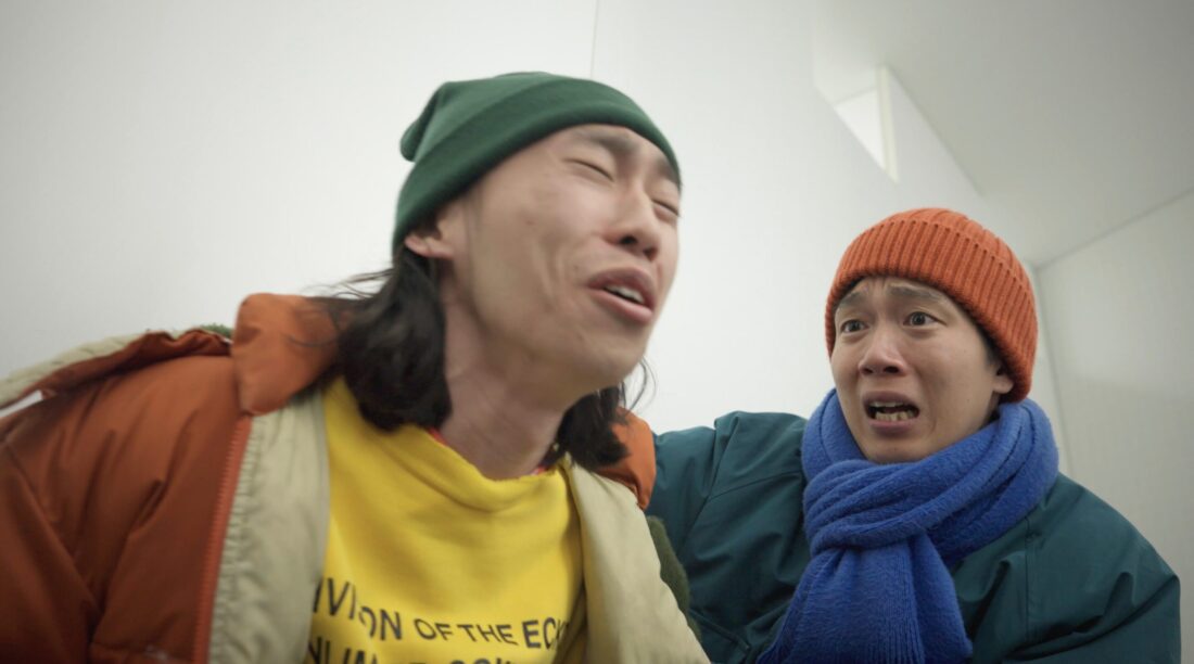 生牡蠣パーティーのせいで腹痛に苦しむ嶋と松下は、混雑した男子トイレで順番を待っている。