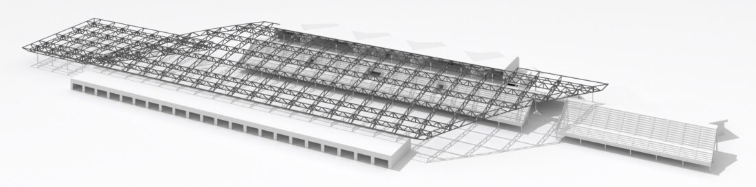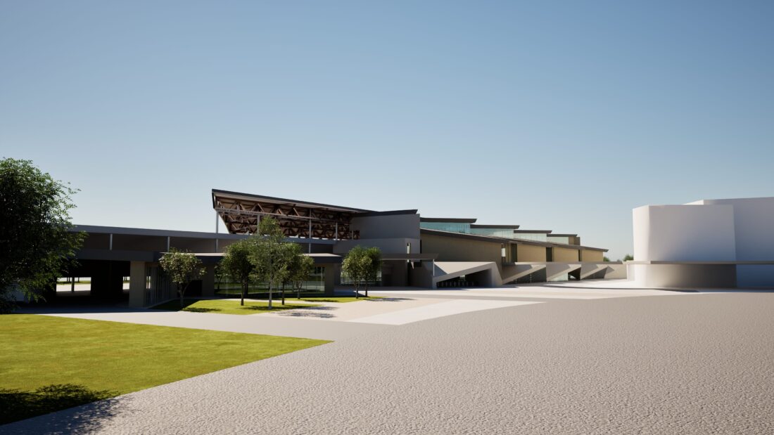 東京ビッグサイトの象徴といえば、巨大な逆三角形の構造体である。本設計では、あの力強くアイコニックな造形をリスペクトし、屋根形状や正面ファサードに現れる三角形のモチーフをデザインの共通言語とした。これにより、建築単体としての主張に留まらず、周辺施設との視覚的な連続性を生み出し、都市風景に自然と溶け込ませることを形態コンセプトの核としている。