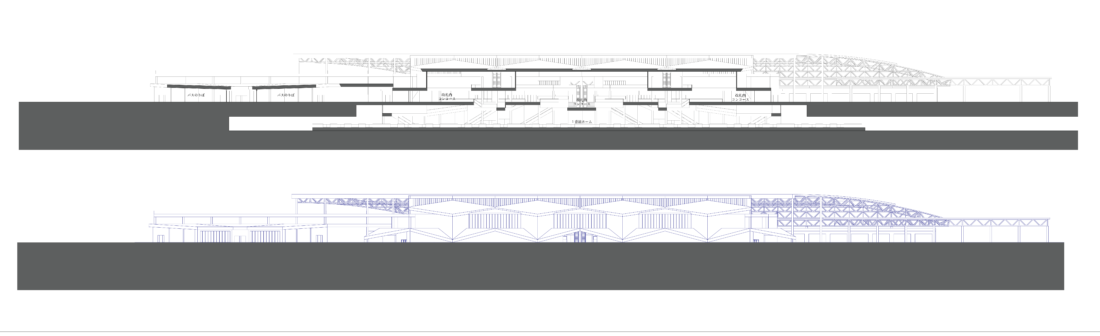 地下鉄とサーキットの2つの「線的要素」を拾い、速度軸として建築のスケールを決定する。建築は海岸に沿って長く計画し、南北への抜け感を意識させる。