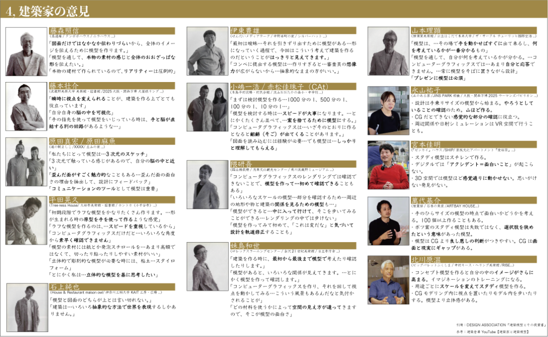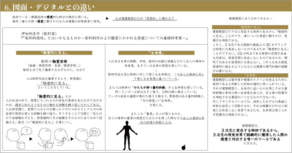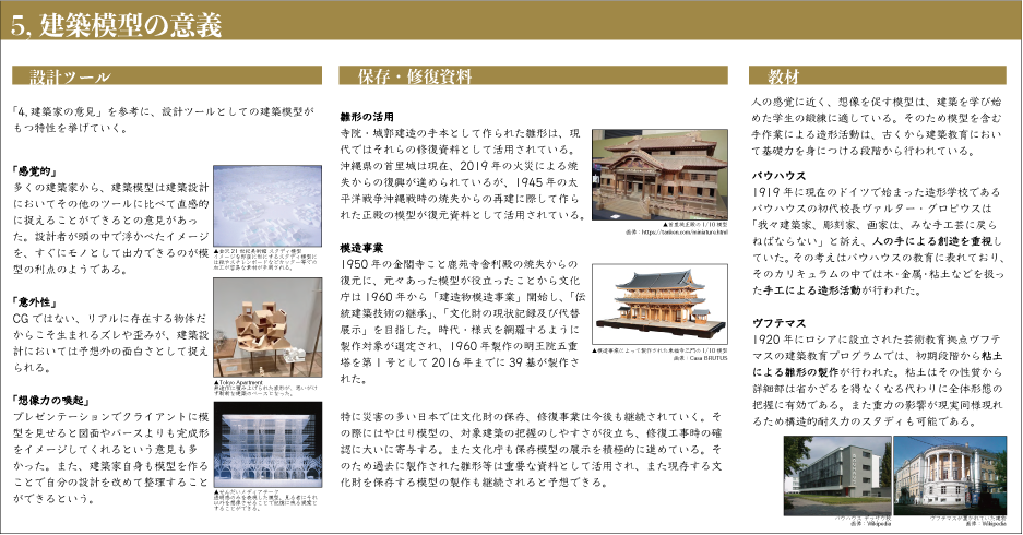 また建築模型の意義を再確認しその他のツールにはない特性を見つけることで、建築模型が代用されにくい無二のツールであることを確認しようとした。
